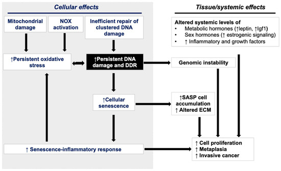 Intrinsic alterations in the DDR and ongoing DNA damage caused by persistent oxidative stress could potentially amplify the number of DNA damage sites with time. Activation of the DDR-mediated cell-cycle checkpoint in GI-stem cells with sublethal DNA damage might result in permanent growth arrest and cellular senescence. Persistent DSBs and DDRs observed long-term after heavy-ion exposure were associated with no significant change in the number of dying cells (marked by the TUNEL assay), an increased GI-epithelial cell proliferation (marked by phospho-histone H3, Ki67, and PCNA), [50,71,76,77], and an increase in the accumulation of senescent cells (marked by SA-β-gal, p16, and Glb1) [71,72]. Stress-induced senescence (SIS) is generally independent of telomere erosion and classified as either oncogene-induced senescence (OIS) or DDR-induced senescence. Indications for both OIS- and DDR-induced senescence in the promotion of heavy-ion-induced GI cancer have been observed [71,72,110]. However, the initiation of SIS appears to be DDR-induced in the beginning, and later on, the activation of OIS is likely to follow. Additionally, cells displaying persistent DNA damage signaling are more likely to secrete inflammatory cytokines [136] and display the SASP [71,72]. DDR proteins appear to be required for the initiation and persistence of inflammatory cytokine secretion from irradiated cells; for example, ATM (a key DDR component) is an essential factor for IL-6 secretion in senescent cells [136]. Studies using heavy-ion-irradiated Lgr5-EGFP-IRES-creERT2 mice expressing reporter EGFP and CreERT2 fusion proteins in Lgr5+ intestinal stem cells demonstrated the acquisition of senescence and SASP as a result of persistent DNA damage [71]. Heavy-ion-induced SASP in mouse GI tissue was also accompanied by an increased secretion of inflammatory cytokines, including IL-6 [71]. Additionally, both DDR activity and IL-6 are often elevated in CRC. Therefore, apart from regulating DNA repair and cell-cycle progression, DDR signaling in cells with persistent DNA damage could influence the tissue microenvironment via provoking robust SASP signaling [136].