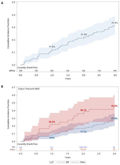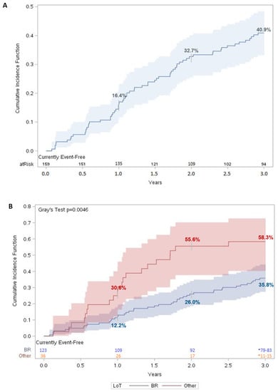 Three years after the initiation of a first LoT, 40.9% (95% CI: 33.2–48.4%) of the MCL patients initiated a second-line treatment or died (Figure 2A). For patients who initiated a second LoT, the median time to the second LoT was 15.2 months (1.3 years). When stratified by regimen received, only 35.8% (95% CI: 27.4–44.2%) of patients on BR had a combined outcome of initiating a second LoT or death three years after initiating a first LoT, compared with 58.3% (95% CI: 40.2–72.7%) of patients who received another regimen (Figure 2B). The difference in TTNTD was statistically significant (p < 0.005).