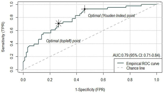 Ten patients (7% of 138) were excluded in this step due to missing data in either smoking or ECOG, and hence, the final model was conducted on 128 patients. The final MV logistic model demonstrated a good classification performance with an AUC of the ROC at 0.79 (95% CI: 0.71–0.84) (Figure 1). The Youden cut-off for the ROC curve was 0.20, with the corresponding SN and SP being 0.93 and 0.54 while the “topleft” cut-off was 0.33, which yielded a balance between the SN and SP (0.71 and 0.74, respectively).