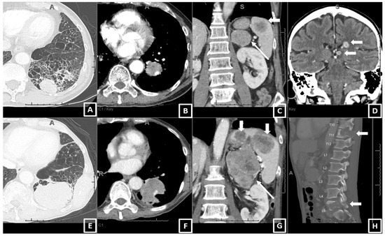 An example of a patient who had PD with pembrolizumab monotherapy and had a high value for the predicted risk of progression (0.93) using the prediction equation and the Youden cut-off. A 64-year-old male, current smoker, with 30 pack years, ECOG 2, diagnosed as stage IV NSCLC (adeno.). The baseline CT (A–D) showed (A) a 3.5 cm left lower lobe (LLL) primary lung mass, (B) a 2.2 cm LLL lobar adenopathy (also at the hilum and mediastinum, now shown), metastasis in the left adrenal and spleen (long and short arrows in (C)), and brain (D). After 3 months on pembrolizumab, the patient developed progressive disease on the 1st FU CT (E–H), including enlarging the LLL mass (6.1 cm, (E)), lobar adenopathy (3.2 cm, (F)), enlarging and new metastasis in the left adrenal and spleen (G), and worsening destructive bone metastases (H). The brain metastasis was radiated and improved. The patient died 7 weeks after the FU CT.
