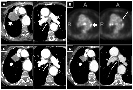 An example of a patient who had PR with pembrolizumab monotherapy and had a low value for the predicted risk of progression (0.03) using the prediction equation and the Youden cut-off. A 79-year-old female, ex-smoker, with 45 pack years, ECOG 1, diagnosed as stage IIIC NSCLC (adeno.). (A) The baseline CT showed a 6.0 (T3) right upper lobe primary lung tumor and 1.8 cm short axis subcarinal adenopathy (T3N2, short and long arrows in (A)), while (B) PETCT showed contralateral hilar and mediastinal adenopathy suggestive of N3 (short and long arrows in (B)). (C) The 1st FU CT after 11.5 weeks on pembrolizumab showed a partial response (PR) (RUL tumor decreased to 3.2 cm and LN decreased to a 0.7 cm short axis), and (D) the 2nd FU CT after 28 weeks showed a stable disease. The patient showed early signs of disease progression on the CT after 54 weeks on pembrolizumab.