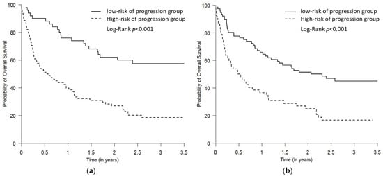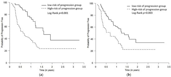 The progression-free survival (PFS) and overall survival (OS) between the predicted high- vs. low-risk progression groups were compared by Kaplan–Meier plots using log-rank tests. PFS was defined as the time from starting pembrolizumab to the earliest CT date that showed disease progression or the latest available CT date for patients with no sign of progression. OS was defined as the time from starting pembrolizumab to death or the date of the last follow-up.