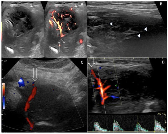 Multiparameter Doppler US assessment of left thyroid mass: reticulated pattern and malignant vasculature. (A,B). Axial US grey scale and Power Doppler showing EuTIRADS5 67 mm left thyroid mass with intervening echogenic septa-like structures (arrow heads) that correlate with fibrosis on histopathology [], increased vascularity (arrow), unclear boundaries. “Sword-like” vessel is abnormal aberrant tumour artery merely noticed in dedifferentiated thyroid cancers, ATC and PTL (arrow A,C,D). High resistive index (RI = 1) is shown on spectral analysis (D). High RI > 0.75 is typical of malignant neoangiogenesis [].