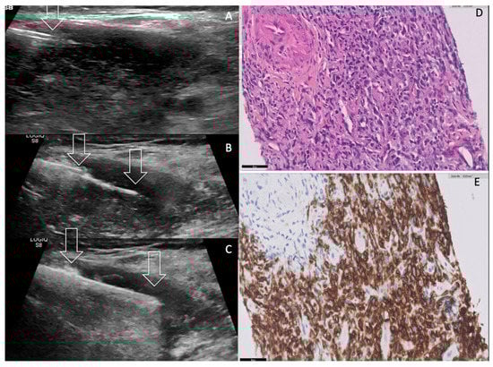 Core Needle Biopsy (CNB) technique and results. (A) CNB was performed using horizontal percutaneous right-to-left trans isthmic 17G needle trocar (A–C). Note advance of trocar tip within the left thyroid mass (arrow). (B) The semi automatic 18G CNB stylet of the cutting needle (between arrows) was then advanced into the tumour tissue, away from the thyroid capsule. (C) Firing the cutting needle (between arrows) was performed after colour Doppler assessment (not shown) to avoid arterial damage. (D,E) Biopsy specimen histopathology showing 15 mm long monomorphic sheets of large atypical lymphoid cells, containing numerous easily identifiable mitoses (Haematoxylin and Eosin staining × 400). Immunostaining with the pan B anti-CD20 antibody showed strong positivity (in brown) of all the atypical cells; ×400. CD20+ and CD3- were the signature of B lymphoma. Note the absence of lymphocytic thyroiditis and germinal centres. See also Video File S1.