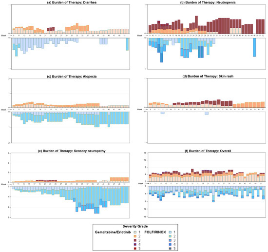 We analyzed the overall burden of therapy and the burden caused by the common TEAEs skin rash, sensory neuropathy, alopecia, diarrhea, and neutropenia in the phase II RASH trial (Figure 2). As expected, the occurrence of skin rash was significantly more common in the gem/erlotinib arm (p < 0.0001), whereas the burden of therapy caused by sensory neuropathy was significantly higher in the FOLFIRINOX arm (p = 0.0048). The BOTh®TM graph clearly depicts the increase in sensory neuropathy severity over time, not only in prevalence but also in severity. While alopecia was a frequent burden in both treatment arms, it seemed more common in the FOLFIRINOX arm; however, this difference was not statistically significant. Interestingly, diarrhea was a common TEAE in both arms, but the burden decreased in the FOLFIRINOX arm over time while it remained fairly stable in the gem/erlotinib arm. Neutropenia, an important TEAE often related to treatment interruptions or infections, was analyzed as well. While there was no clear difference in the burden of therapy for this aspect (p = 0.8), it became apparent that the burden of therapy associated with neutropenia decreased, particularly pronounced in the FOLFIRINOX arm over time, while it remained a relevant TEAE in the gem/erlotinib arm. In the overall comparison of the burden of therapy in the two treatment arms, no statistically significant difference was observed (p = 0.6735). However, there seemed to be a tendency towards a higher burden of therapy in the gem/erlotinib arm. The burden of therapy remained relatively stable over time in both arms, with only the FOLFIRINOX arm showing a higher week-to-week variation in the later phase of the trial. The occurrence of severe TEAEs seemed to be distributed equally not only among the two treatment arms but also over the course of the study.