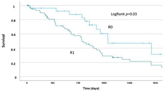 Kaplan–Meier Analysis of postoperative survival for patients with complete resection (R0) and negative lymph node status vs. resected patients with either incomplete resection (R1) and/or positive lymph node status.