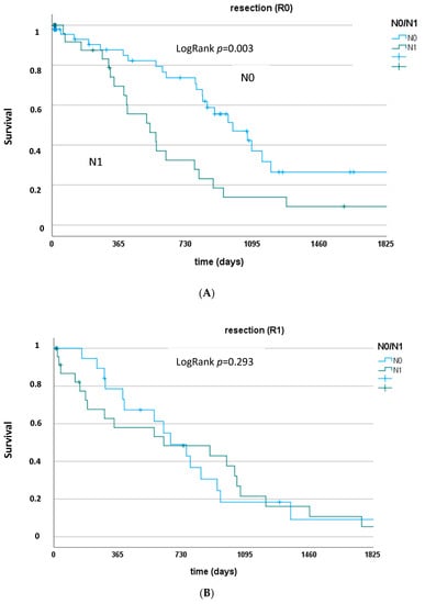 (A) Survival rates of patients with complete resection and negative or positive lymph node status (R0 and N0 vs. N1). LogRank p = 0.003. (B) Survival rates of patients with incomplete resection and negative or positive lymph node status (R1 and N0 vs. N1). LogRank p = 0.293.