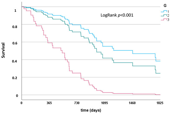 Survival depending on tumor grading (G). LogRank p < 0.001.