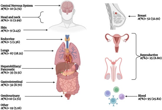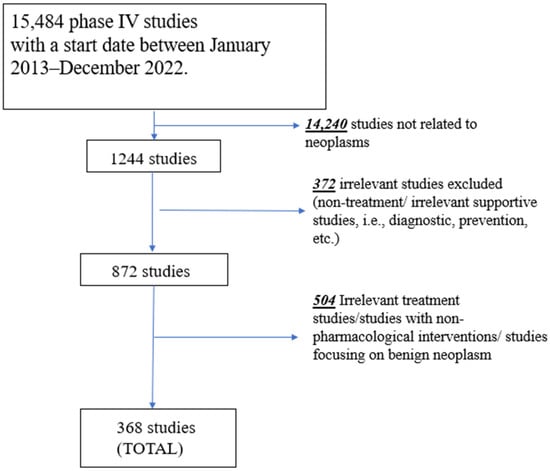 An initial search of ClinicalTrials.gov for phase IV studies was conducted with a start date between 1 January 2013, to 31 December 2022, registered by 31 March 2023. The study selection process is presented in Figure 1. A total of 15,484 phase IV studies were initially identified. Following the use of a filter term, “neoplasms” (which includes terms “cancer” and “tumor”), in line with the terminology of the registry topic selection filter, 14,240 studies were excluded, leaving 1244 potentially eligible studies. Next, studies were excluded by their primary purpose, which can be found in the “study design” section in ClinicalTrials.gov. All non-treatment studies (i.e., prevention, diagnostic, supportive care, health services, and basic science) were excluded (n = 372). Next, the remaining 872 studies were reviewed independently by two authors (PO, AN) to exclude all studies focusing on non-oncological pathologies (i.e., rheumatoid arthritis, etc.) that were not excluded using the above filters and studies focused on broad cohorts with various indications (not specific to cancer patients). Moreover, if studies were not exclusive to or strictly focused on therapeutic agents (defined as drugs or devices) as a treatment for cancer or were non-pharmacologic studies (surgery or radiotherapy), they were excluded as per the a priori eligibility criteria (n = 504). After the eligibility review process, a total of 368 studies remained eligible and were included in this investigation. A list of the included studies with their identification number and title was added as supplementary material.