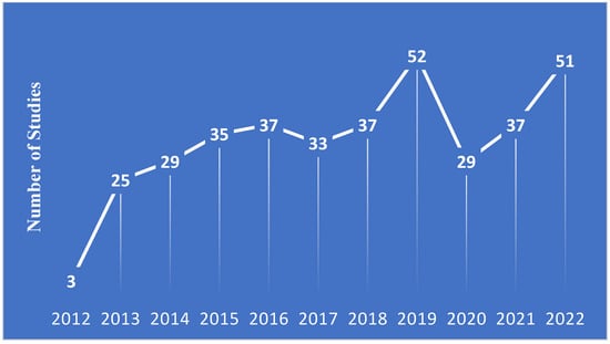 A total of 368 phase IV oncology studies started between January 2013 and December 2022 were included in the present analysis, 35.9% of which were currently reported as active as of 31 March 2023. Figure 2 shows the number of studies in the registry by start year. The full characteristics of the included studies are presented in Table 2. Among the included studies, only 19.8% were limited to a single-sex. The majority of studies (86.1%) did not include children (<18 years), while only 6.8% excluded elderly (>65 years) participants. Most of the included phase IV studies were focused on solid tumors (71.2%).