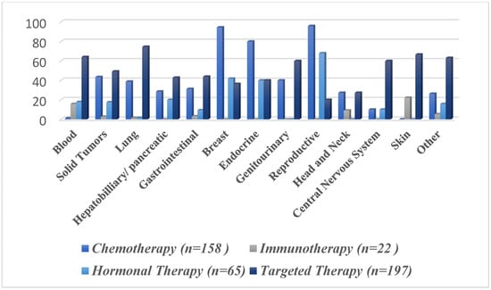 The most frequently analyzed oncological interventions in the last decade were therapeutics regarded as targeted therapy (53.5%), chemotherapy (42.9%), hormonal therapy (17.6%), and immunotherapy (5.9%). Moreover, the characteristics of the study design regarding these interventions were also investigated. Unsurprisingly, the majority of the aforementioned anti-cancer therapies were open-labeled trials (94.4%, 92.5%, 86.1%, and 95.4%, respectively) (Table 3). The intervention model varied considerably between these therapeutic interventions. The present study shows that the parallel arm design was the most frequently used approach in clinical trials investigating chemotherapeutic (59.4%) and immunotherapeutic agents (45.4%). However, the single-group assignment was the most commonly utilized design in both hormonal (50.7%) and targeted therapies (63.4%). The studies which investigated chemotherapeutic treatments used most commonly subject groups with breast (32.9%) or lung (16.4%) cancer. Moreover, the hormonal therapies were mostly investigated in cohorts with breast (35.3%), reproductive (26.1%), and blood cancers (26.1%). Targeted therapies and immunotherapies were most frequently investigated in patients with blood cancers (30.9% and 68.1%, respectively).