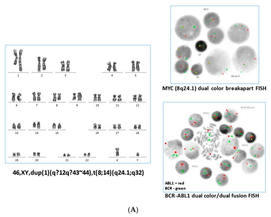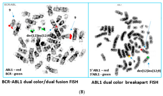 - Song, J.S.; Shin, S.Y.; Lee, S.T.; Kim, H.J.; Kim, S.H. A cryptic ETV6/ABL1 rearrangement represents a unique fluorescence in situ hybridization signal pattern in a patient with B acute lymphoblastic leukemia. Ann. Lab. Med. 2014, 34, 475–477. [Google Scholar] [CrossRef]