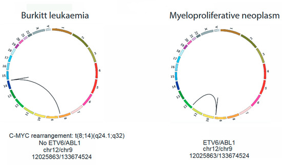 Circos plots generated from WGS of the Burkitt Leukaemia (left) and MPN (right) samples. Both samples represent diagnostic specimens (peripheral blood for the Burkitt leukaemia and bone marrow aspirate for the MPN). ETV6-ABL1 rearrangement (chr12:12025863-chr9:133674524) was confirmed only in the MPN sample.