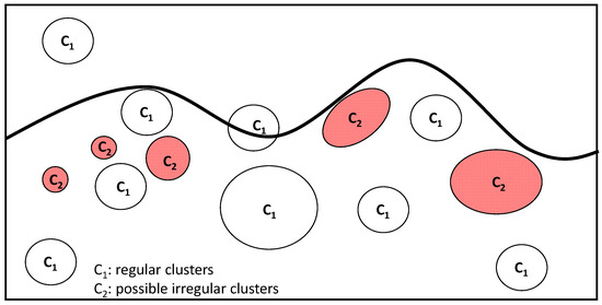 NM pre-screening training model approach based on the identification of a class of possible anomalous clusters and of a class of regular clusters. The FRF algorithm training was performed on the same image.