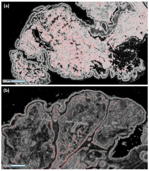 The very good performance of the algorithm (see the “Precision” parameter, Figure 3) indicates that the algorithm automatically defines the number of instances required for the best computation. A limit is certainly the first setting of the parameter of the algorithm (see the definition of the parameters, such as the Gaussian/Sobel/Hessian filter parameters bilateral/Lipschitz/Gabor/derivative/structured filtering conditions, etc. [13]). Moreover, the high level of sensitivity of the error response was confirmed by slowly varying the algorithm’s parameters. Also, other neural network algorithms could be used for image processing, such as long short-term memory (LSTM). This last algorithm requires the establishment of further settings of parameters calibrated for specific images, which could increase the error calculus. The choice of FRF was then mainly due to the optimisation of the dermatopathology platform to decrease the computational time and simultaneously increase the response accuracy (the main properties of the FRF algorithm).