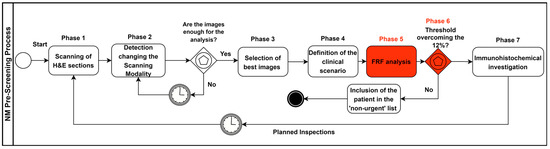 The pre-screening clinical process based on the integration of the FRF analysis was designed by using the business process modelling and notation (BPMN) approach. The BPMN is an international standard (ISO/IEC 19510:2013 “Information technology, Object Management Group Business Process Model and Notation”) used to design processes, including machine learning decision-making tools [17], and it is adopted to improve healthcare organizational processes [18]. The goal of the adopted BPMN approach was the standardization of the new clinical pre-screening protocol to facilitate scientific approval. The BPMN models will be revised in another paper updating the protocols and refining the procedure to further decrease the NM risk.