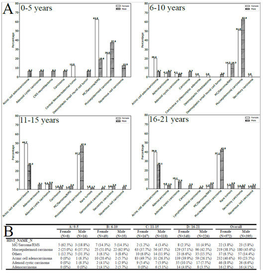 Malignancies of the major salivary glands (MSGs) are rare in children, and investigating epidemiologic and prognostic factors are key to improving survival. The majority of pediatric MSG malignancies occur in the parotid gland [23] and are of epithelial origin, with a predominance of MEC and ACA [1,3,4,10,11]. While some reports favor MEC as the most common carcinoma [2,23,24,25,26], others support a predominance of ACA or nearly equal frequencies of ACA and MEC [27,28,29,30,31]. The epidemiology of pediatric salivary gland tumors varies by geographic location [32,33], but our findings also show variation by age group, race, and gender. We confirmed an overall female predominance [4,34,35,36], and MSG tumors tend to be rarer during the first decade [4], with 88.9% of cases reported in the 11–21-year-old population. Contrary to a previous report [2], MEC dominated the submandibular location with ACC as the second most frequent malignancy. We observed the pediatric ratio of parotid-to-submandibular gland malignancies to be somewhat different from the adult population. We found a greater rate of pediatric MSG tumors (86.1%) located in the parotid gland. In the 0–5-year-old population, MC/sarcoma/RMS and MEC were observed to be the most common MSG tumors. These tumor classes were equally represented but with a different sex ratio: a female predominance for MC/sarcoma/RMS. ACA was the predominant histology encountered in females in the 11–21-year-old group, whereas MEC dominated in males. Racial differences were observed in the 0–5-year group with a notable predominance of White children presenting with MC/sarcoma/RMS pathology and African Americans presenting with a MEC. ACA tumors were most prevalent in females, as suggested in other adult series [37,38,39], and MEC was more frequent in males.
