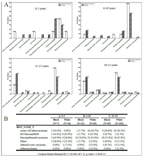 The statistical analysis revealed a significant correlation between histology, age group, and race (p < 0.001; Figure 2B). Among patients aged 0–5 years, MC/sarcoma/RMS tumors were more frequently observed in White patients, while MEC tumors were more common in African American patients across all age groups (Figure 2). The incidence of ACC was extremely low in the 0–5-year-old White population but increased with age (Figure 2A,B). In the 16–21-year-old White population, ACA was the most commonly observed parotid malignancy, while MEC was more frequent in the African American population (Figure 2B).