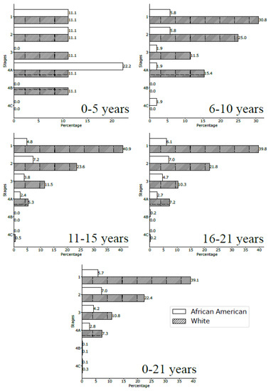 Stages at diagnosis for the African American and White pediatric population by age-group (all locations).