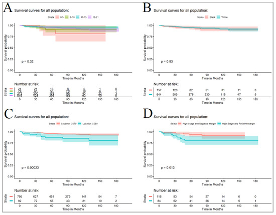 The overall 5-year survival rate was 94.9% (95% CI—93% to 96%) with no significant difference between the lowest and highest rates (chi-squared test; p = 0.331). The 0 to 5-year-old group had the lowest survival rate of 90% (95% CI—76% to 100%), while the 11–15-year-old group had the highest survival rate of 96% (95% CI—93% to 98%), as shown in Figure 4A. There were no significant racial differences (p = 0.816), as shown in Figure 4B. Histology was found to significantly affect the 5-year survival rate (p = 0.003), with a lower survival rate observed for RMS (78%, 95% CI—66% to 93%) compared to epithelial salivary gland neoplasms (96%, 95% CI—94% to 98%). Tumor location was also found to significantly affect the 5-year survival rate (p = 0.009), with parotid malignancies having a higher survival rate (96%, 95% CI—95% to 98%) compared to submandibular neoplasms (87%, 95% CI—80% to 95%), as shown in Figure 4C. Margin status was found to be significantly associated with 5-year survival in high-stage tumors (p = 0.003), with negative margins showing an observed survival rate of 94% (95% CI—89% to 99%) compared to positive margins, which had a survival rate of 80% (95% CI—71% to 90%), as shown in Figure 4D.