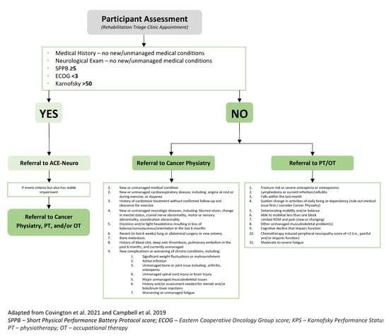 The triage clinic was led by a physical medicine and rehabilitation resident physician (LCC) and the ACE-Neuro study coordinator (JTD; clinical exercise physiologist). Participants were booked for a 45-min appointment, during which their medical and functional histories were reviewed, and a full central and peripheral neurological examination and the Short Physical Performance Battery Protocol (SPPB) were performed [32]. From this, the Karnofsky Performance Status (KPS) and Eastern Cooperative Oncology Group (ECOG) scores were determined. Criteria for triage included the SPPB, ECOG, and KPS, as well as previously published referral recommendations from Covington and colleagues [14] and pre-determined cut-offs from our clinical team. These pre-determined cut-offs were developed following consultation and deliberation with a multidisciplinary team, including rehabilitation clinical team leaders, physiotherapists, occupational therapists, physical medicine and rehabilitation doctors, behavioural medicine researchers, and clinical exercise physiologists. Please see Figure 1 for the triage clinic criteria. After the assessment, participants were then triaged and referred to the ACE-Neuro exercise study, Cancer Physiatry, Rehabilitation Oncology (i.e., Physiotherapy/Occupational Therapy), or a combination of these services. As part of the ACE-Neuro study, if triage to the ACE-Neuro exercise study was not appropriate after the triage clinic assessments, patients could be re-assessed in the triage clinic once deemed appropriate by their clinical team (i.e., oncologist, physiotherapist, or occupational therapist).