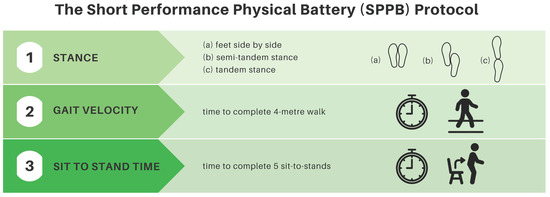 - Vasunilashorn, S.; Coppin, A.K.; Patel, K.V.; Lauretani, F.; Ferrucci, L.; Bandinelli, S.; Guralnik, J.M. Use of the Short Physical Performance Battery Score to predict loss of ability to walk 400 meters: Analysis from the InCHIANTI study. J. Gerontol. A Biol. Sci. Med. Sci. 2009, 64, 223–229. [Google Scholar] [CrossRef] [PubMed]
