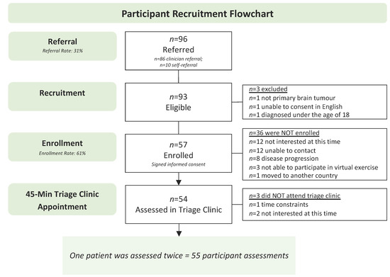 Feasibility was the primary outcome with both quantitative and qualitative components. Quantitatively, feasibility was defined a priori as a referral rate of at least 50%, an enrollment rate of at least 50%, and a triage clinic attendance rate of at least 60%. These feasibility thresholds were based on other feasibility work in exercise oncology as well as on feedback from the clinical team [28,29,30]. Specifically, given the poor survival prognoses and high symptom burden of neuro-oncology patients, lower criteria were expected.