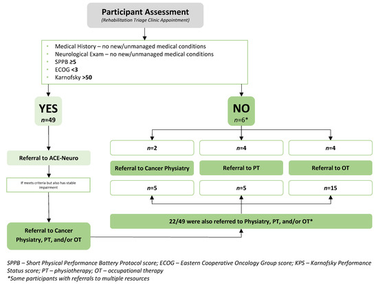 Therefore, the objective of this research was to identify rehabilitation and exercise needs in an underserved oncology population, and study triage and referral processes to enhance patient rehabilitation and care. This manuscript presents data on the feasibility of the rehabilitation and exercise triage clinic as part of the Alberta Cancer Exercise–Neuro-Oncology study (ACE-Neuro) [25]. Specifically, the implementation of the triage clinic is reported, including the (a) assessment of rehabilitation and exercise needs of patients with brain tumours (i.e., neuro-oncology patients) and (b) the triage and referral of participants to physiatry, physiotherapy, occupational therapy, and/or exercise (i.e., ACE-Neuro) based on pre-determined cut-offs. Neuro-oncology patients were selected as a population of interest as they face unique functional challenges given side effects related to tumour location and treatments. They frequently experience cognitive, physical, and psychological impairments, and often report that their needs are not adequately addressed [26,27]. Unfortunately, methods to effectively screen and refer neuro-oncology patients to appropriate rehabilitation interventions are lacking [26,27]. Fortunately, there is great potential to continue to expand on the rehabilitation and exercise evidence for patients with brain tumours, including effective methods to identify patients in need and refer them to tailored rehabilitation programs [5,12].