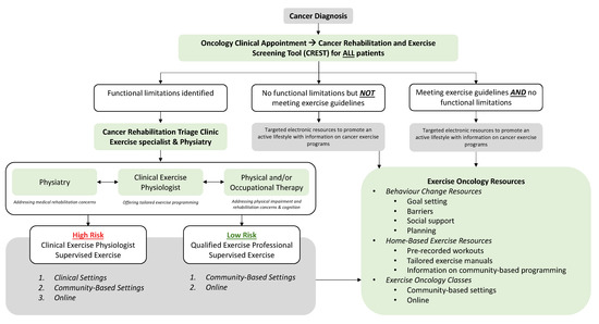 The concept of cancer rehabilitation and exercise was first introduced over 40 years ago, with barriers at that time including difficulty identifying patients in need, and awareness from oncologists on the role of rehabilitation and activity [40]. Unfortunately, these same barriers exist today [12,15,16]. With improving survival rates among cancer patients, the role of functional rehabilitation and exercise is more important than ever [1]. Cancer survivors report long-term concerns with function, quality of life, and inactivity following their diagnosis [2,3]. To date, consistent screening for inactivity and impairment, as well as triage and referral pathways (i.e., through the EMR) to appropriate rehabilitation and exercise resources (i.e., physiatry, physiotherapy, occupational therapy, and exercise), do not exist in most cancer care systems.