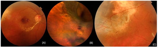 Radiation-induced retinopathy is a slowly progressive, delayed-onset disease of the retinal blood vessels, constituting the most common cause of permanent visual loss, especially when the macula is involved [,]. The disease occurs in about 25–28% of patients having been treated with PBT, while this percentage rise to 90% in a 5-year follow-up. The relative occurrence in patients treated with plaque radiotherapy is 4.6–66% within 20–31 months post-radiation, whereas it is around 17–35% after gamma knife radiosurgery [,,,,,,,,,,,,,,,,,]. According to Sagoo et al., approximately 66% of 650 eyes treated with plaque radiotherapy developed nonproliferative radiation retinopathy, while around 24% of eyes developed proliferative radiation retinopathy over 5 years of follow-up []. Histopathological findings typically include focal narrowing and the obliteration of capillaries, the disruption of pericytes and endothelial cells that form blood vessel walls, and the formation of microaneurysms []. These issues lead to a remodeling of blood flow, alternative channels with thickened and fenestrated walls, and irregular dilation of the adjacent microvasculature [,,]. Eventually, capillary and pericyte loss occurs, followed by perivascular white sheathing. After a total occlusion, ghost vessels are seen, resulting in retinal ischemia and atrophy [,,]. Patchy degeneration of the RPE in the form of loss of melanin, accumulation of lipofuscin, hyperplasia and beading, telangiectasia, microaneurysms, sclerosis, and closure of choroidal vessels have also been described [].