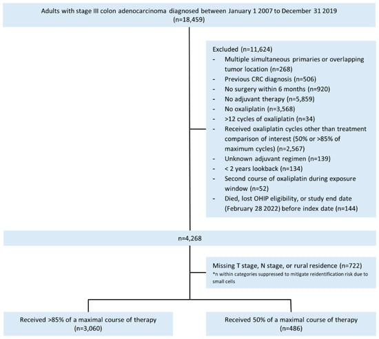 We used the algorithms described in Table 1 to identify Ontario residents aged ≥18 years at the time of diagnosis of incident stage III adenocarcinoma of the colon in the Ontario Cancer Registry (OCR) between 1 January 2007 and 31 December 2019.Individuals were excluded for any cancer diagnosis within 5 years prior to colon cancer diagnosis, a prior colorectal cancer diagnosis at any time, multiple simultaneous primary colon cancer diagnoses, no curative resection within 6 months of diagnosis, failing to initiate adjuvant therapy within 16 weeks of surgery, less than 2 years OHIP coverage prior to the date of first adjuvant treatment, and an indeterminate oxaliplatin regimen.