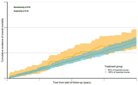 We conducted non-inferiority analyses for overall mortality and cancer-specific mortality in the primary comparison of 50% versus >85% of a maximal course of adjuvant therapy in the overall cohort. Non-inferiority was declared if the upper limit of the two-sided 95% CI was ≤1.11 (the IDEA overall survival non-inferiority margin). The upper limit of the CIs for both overall mortality and cancer-specific mortality exceeded the non-inferiority margin. We subsequently used two-sided 95% CI to assess the superiority of >85% to 50% of a maximal course of adjuvant therapy.
