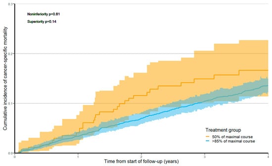 Cumulative incidence functions for overall mortality and cancer-specific mortality are plotted in Figure 2 and Figure 3, respectively. The overall mortality risk over 5 years was 16.2% (95% CI 12.6–20.3) among patients treated with 50% of a maximal course of therapy versus 14.8% (95% CI 13.0–16.7) among patients treated with >85% of a maximal course. The HR for the association of treatment with 50% versus >85% cycles of oxaliplatin-containing adjuvant chemotherapy and overall mortality was 1.13 (95% CI 0.88–1.45, non-inferiority p = 0.55, superiority p = 0.34).