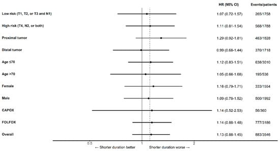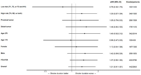 Cancer-specific mortality for 50% versus >85% of a maximum duration of oxaliplatin-containing adjuvant chemotherapy by subgroup after applying overlap weights. The dashed line denotes the non-inferiority margin. CI, confidence interval; sHR, subdistribution hazard ratio. The estimate for cancer-specific mortality within patients who received CAPOX is not shown because the propensity score was not estimable in this small subgroup. The finding that some subgroup estimates do not bound the overall estimate results from the non-collapsibility of hazard ratios obtained from our models. Because of this characteristic of hazard ratios, the overall estimate is not a weighted average of subgroup estimates, and both subgroup estimates may lie to either side of the overall estimate even in the absence of confounding factors [].