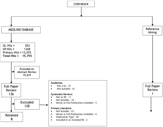 If no guideline or systematic review was identified for a particular research question, then a search for primary literature was conducted. Moreover, an updated search for primary literature was performed for any included systematic review from the point in time that the existing systematic review search ended.
