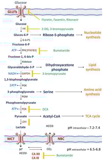 Schematic representation of glycolysis and then the enzyme involved. The antiglycolytic drugs are shown in green and the enzyme or transporter that each drug blocks is demonstrated by the yellow mark. Carbonic anhydrases XII (CA XII) and CAIX regulate the intracellular pH at 7.2–7.4 in order for the glycolytic enzymes to be active. Na-Bicarbonate cotransporter (NBC) and Monocarboxylate transporters (MCT) play a crucial role in pH regulation. GLUT = Glucose transporter; hexokinase = HK; G-6-P1 = Glucose-6 phosphate dehydrogenase; PFK = Phosphofructokinase; GAPDH = glyceraldehyde phosphate dehydrogenase; PGK = phosphoglycerate kinase; PGM = phosphoglycerate mutase; PDK = pyruvate dehydrogenase kinase; LDH = Lactate dehydrogenase; 2-DG = 2-deoxy-D-glucose; DCA = Dichloroacetate; TCA = Tricarboxylic acid.