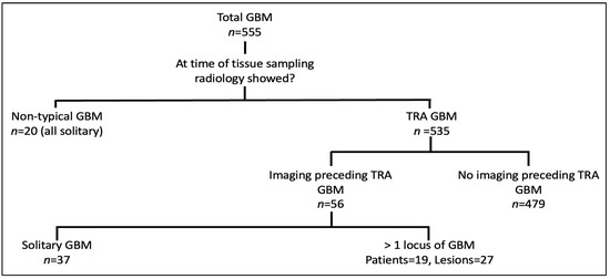 - Non-typical GBM—patients who had tissue sampling and never showed TRA GBM, n = 20 (3.6%);