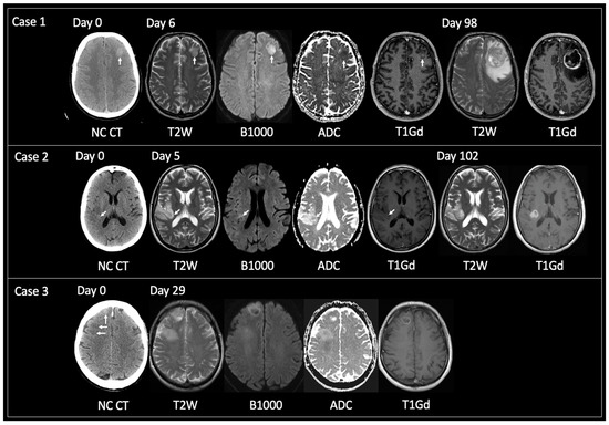 Examples of solitary lesions with TRA GBM at tissue diagnosis that had preceding imaging. Case 1: 56-year-old male presented with seizures. Unenhanced CT on day 0 showed a hyperdense lesion in the left frontal lobe. This had corresponding T2 iso signal with reduced diffusivity and central nodular enhancement on MRI day 6. TRA GBM followed on MRI day 98. Case 2: 53-year-old female presented with several days of intermittent left-sided anesthesia. Initial unenhanced CT day 0 showed a focus of hyperdensity within the posterior aspect of the right insula (arrow) with adjacent cortical low density. MRI day 5 revealed an infiltrative glioma within the right inferior parietal lobule and right insular with the focus of prior CT hyperdensity corresponding to T2 iso signal, reduced diffusivity and containing a tiny dot of enhancement (arrows). MRI day 102 showed TRA GBM at the site of the prior CT hyperdense focus but relative stability of the rest of the non-enhancing tumor. Case 3: 63-year-old male presented with seizures. Unenhanced CT day 0 revealed two abnormal areas: a hyperdense focus anteriorly in the right superior frontal gyrus (vertical arrow) and subcortical hypodensity in the right middle frontal gyrus (horizontal arrows). These foci were linked by hypodensity (not shown) correlating with one diffuse tumor. MRI day 29 demonstrated interval growth of the previously hyperdense lesion, showing TRA GBM with enhancing periphery and central necrosis. Note how the peripheral tumoral tissue shows T2 iso solid signal with reduced diffusivity and enhancement. MRI day 29 also showed progression of the previously low-density lesion but not to TRA GBM. This lesion was shown to infiltrate into the deep white matter of the right centrum semiovale, contain areas of reduced diffusivity but no enhancement. TRA GBM—typical radiological appearance of glioblastoma, NC CT—non-contrast CT, T2W—T2-weighted, B1000—DWI, ADC—apparent diffusion coefficient map of DWI, T1Gd—T1-weighted post-gadolinium.