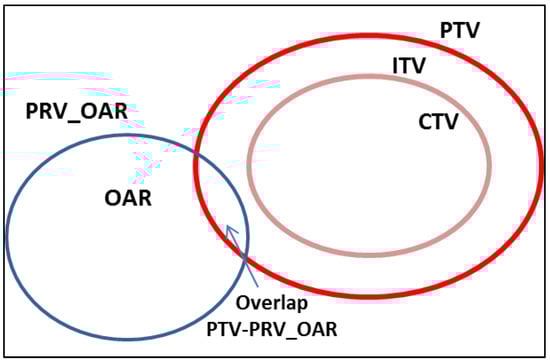 In the area of overlap between PTV and OaR, we delivered the maximum tolerated dose by OaR to minimize the dose inhomogeneity on PTV according to dose-volume constraints, as shown in Figure 1.
