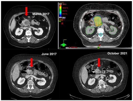 An example of dose distribution and radiological response after SBRT is reported in Figure 2.