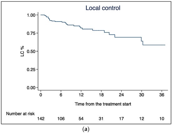 One-, 2-, and 3-year LC rates were 81.9% (95% CI 73.1–88.1), 69.1% (95% CI 54.7–79.8), and 58.5% (95% CI 39.5–73.4), respectively (Figure 3a). The median LC was not reached. According to RECIST criteria (Table 4), we observed one patient with a complete response (0.7%), 31 partial response cases (22%), 81 patients showed disease stability (57%), and 29 (20.3%) had a local progression. Pre-SBRT and post-SBRT FDG-PET CT were performed in 17 patients (12%); in three patients (2.1%) with stable disease on CT scan, FDG-PET CT showed a partial metabolic response, while in five patients (3.5%), with an uncertain persistence of disease on CT scan, FDG-PET CT reported a complete metabolic response, which was also confirmed at subsequent restaging CT scans. Among patients with local progression, seven patients (24.1%) presented isolated local progression of disease without distant metastases, and they underwent retreatment after a gap of one to three years from the end of SBRT. The radiation dose delivered was 20 or 25 or 35 Gy in five fractions, and RT was well tolerated in all retreated patients.