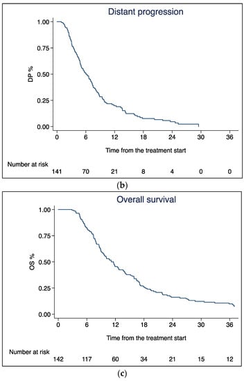 At progression, 42 patients (29.6%) underwent ChT. In cases of oligoprogression, RT was performed on the site of metastatic disease (14 patients, 10%): 10 patients underwent SBRT for liver metastasis (4, 3%), lung lesions (4, 3%) and lymph nodes (2, 1%). Four patients (3%) underwent symptomatic RT treatment for bone metastases.