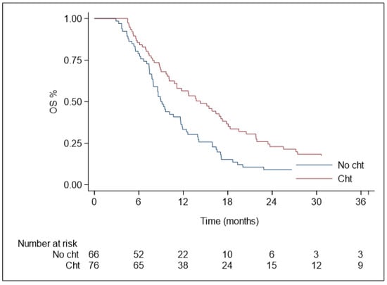Overall survival in patients treated with chemotherapy and SBRT (n = 76) and in patients treated with SBRT alone (n = 66). Specifically, pre-SBRT ChT (HR 0.59, 95% CI 0.41–0.84, p = 0.004) and post-SBRT ChT (HR 0.63, 95% CI 0.43–0.92, p = 0.019) were significantly associated with OS.