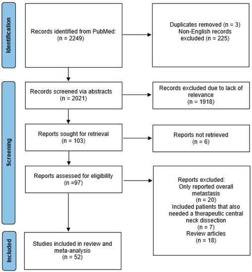 After the initial search, duplicate records were removed, and the remaining studies were screened based on their titles and abstracts, as shown in the PRISMA diagram (Figure 1) [20]. Full-text articles were then assessed for eligibility according to the predefined inclusion and exclusion criteria. Inclusion criteria were primary studies that looked at the occult lymph node metastasis rate according to tumor size in cN0 PTC. cN0 was defined as patients with no lymphadenopathy identified via a physical exam or on ultrasonography before surgery. Exclusion criteria included the following: (1) papers that included patients with lymphadenopathy identified either on a pre-operative physical exam or on imaging, (2) studies that included malignancies other than well-differentiated thyroid cancer, and (3) review articles, case reports, and conference abstracts. Discrepancies between the two authors (LT and JP) regarding study eligibility were resolved through discussion and consultation with a third author (JI).