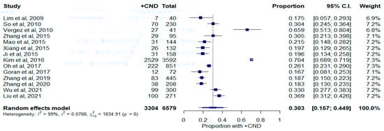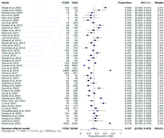The rate of occult CNM using studies with primary tumors measuring less than 1 cm is shown in Figure 3. Studies that reported TNM staging were also included if T1a vs. T1b designations were provided. For primary tumors measuring less than 1 cm, 11,254 out of 29,348 cases had occult CNM, which represents a weighted rate of 32.7% (23.0–42.3%, 95% C.I.). There was significant heterogeneity between these studies (I2 = 99.7%; τ2 = 0.112; Q = 16,296.40; p < 0.0001). Influence diagnostics did not demonstrate a significantly influential study in this size group (Supplemental Figure S1). The funnel plot and Egger test also did not suggest publication bias (Supplemental Figure S2, p = 0.992).