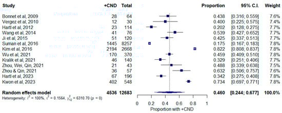 The rate of occult CNM in the 1–2 cm group is shown in Figure 4. Similarly, studies that provided T1a vs. T1b distinctions were also included. There were 4536 out of 12,683 cases with occult CNM. This represented a pooled weighted proportion of 46.0% (24.4–67.7%, 95% C.I.). Study heterogeneity was similar in this group compared to that of other tumor sizes (I2 = 99.8%; τ2 = 0.156; Q = 6310.70; p < 0.0001). There were no studies identified on Baujat plots or via leave-one-out analysis (Supplemental Figure S1). There was no statistically significant publication bias detected via the Egger test (Supplemental Figure S2, p = 0.931).