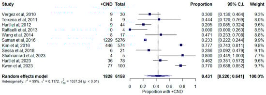 Forest plot depicting proportion of occult central neck disease in patients with tumors measuring less than 1 cm. Abbreviations: +CND: positive central neck dissection; C.I.: confidence interval.