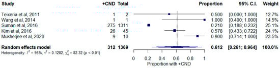 Forest plot depicting proportion of occult central neck disease in patients with tumors measuring less than 5 mm. Abbreviations: +CND: positive central neck dissection; C.I.: confidence interval.