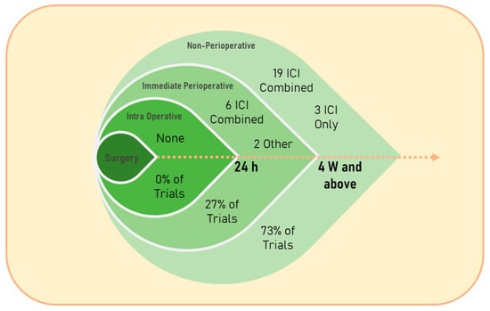 A schematic representation of Table 1. Timing relative to surgery and type of the treatment given to cancer patients in clinical trials found on search results of the keywords “cancer” and “perioperative immunotherapy” in the past five years (since 1 January 2018) on https://clinicaltrials.gov/ (accessed on 14 April 2023). 24 h, 24 hours; 4 W and above, 4 weeks and above; ICI, immune checkpoint inhibition; Combined, ICI therapy combined with other types of interventions.