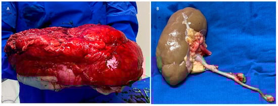 (A) Surgical specimen with the liposarcoma encasing the left kidney. (B) Left kidney after the surgical removal of the liposarcoma, prior to auto-transplantation.